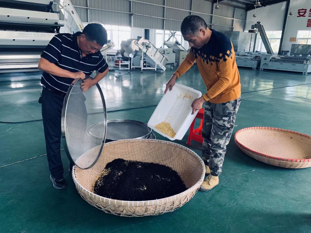 生产车间内,工作人员正在有序地将茶叶按照摊青、加工、发酵、干燥、窨花、烘焙等操作工序,精心研制新型花红茶。通过不断地努力和尝试,成功研制出香气浓郁、口感醇厚的黄金桂花红茶。